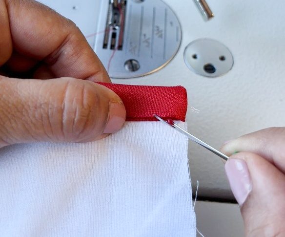 An easy way to finish a Christmas napkin is to edge your regular naplin with a red ribbon. I will show you how you can finish the corner of your napkin with a mitered corner.