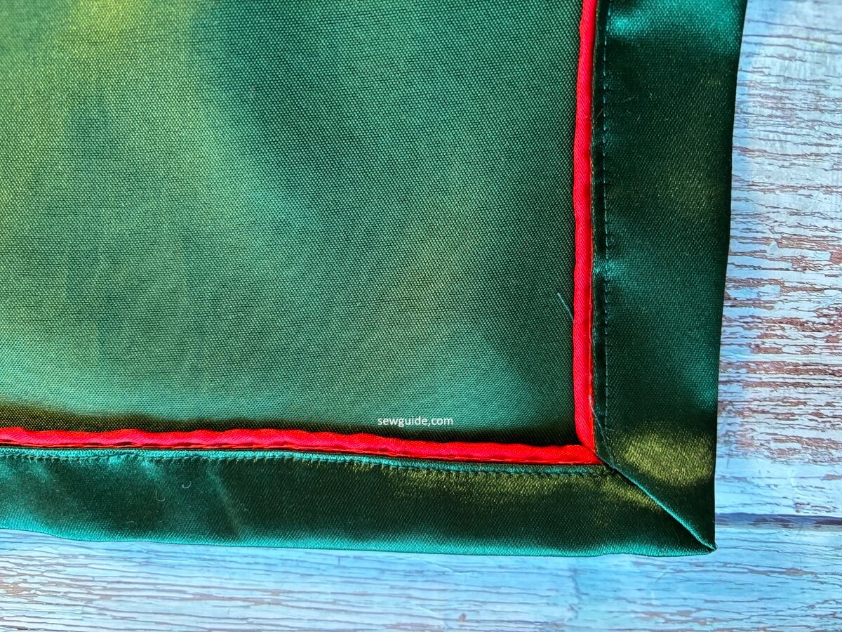 A green napkin with piped edges and mitered corner