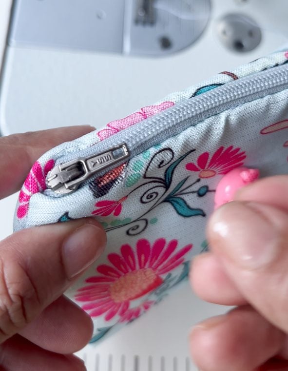 Keep the zipper pull out of the way by stopping with the needle down and then lift presser foot and then slide the pull past the needle; continue sewing.