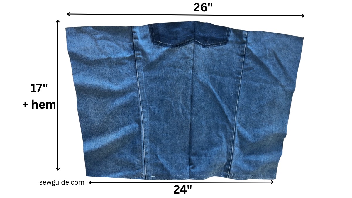 Lay the jeans flat. Measure 18 inch (Length from your shoulder to waist plus seam allowance) If you are using the leg seam, you will not need to leave extra for front piece for the hem. Calculate accordingly.