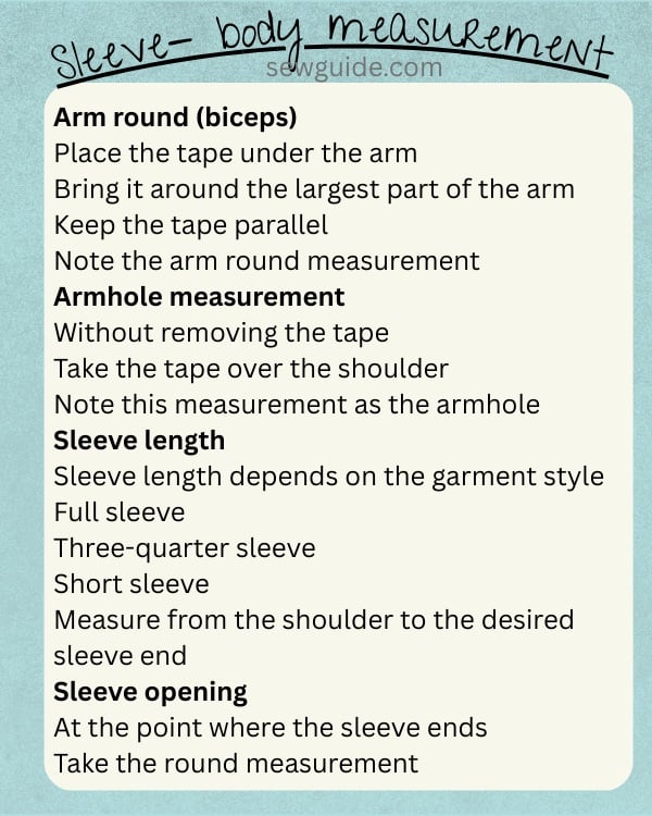 Sleeve length – This is according to your preference . Where your sleeve should end. If the sleeve length is past the elbow you should bend the arm slightly when taking the measurement.