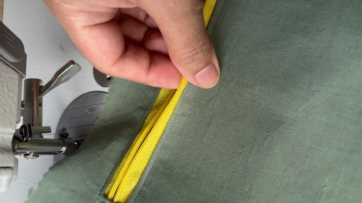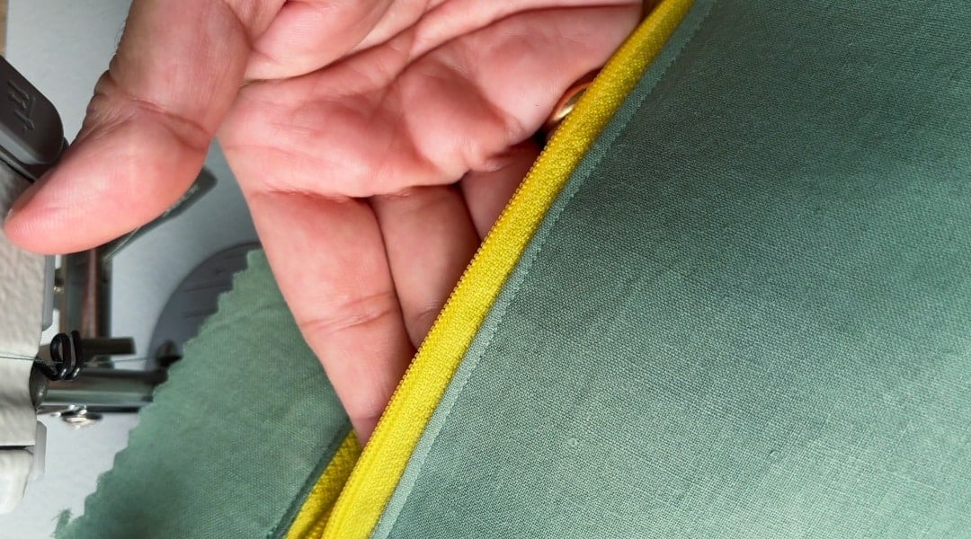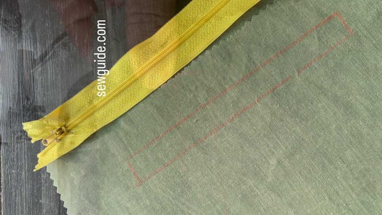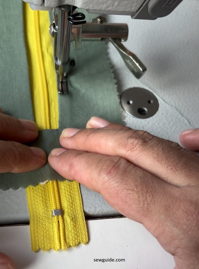 Place the zipper behind the opening. Zipper teeth should be visible and centered