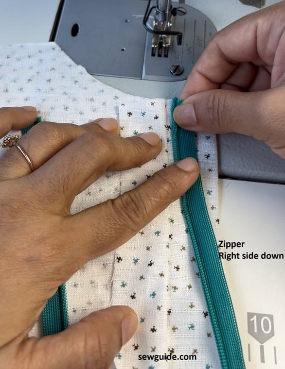 Keep the zipper right side down. Sew the zipper to the seam allowance so that the zipper teeth is aligned with the seam line. As you sew you have to make sure about this.