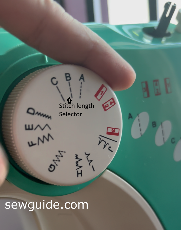 Use the stitch selection dial – this will change the type of stitch you want – straight stitch or zig-zag or whatever other stitches you have.