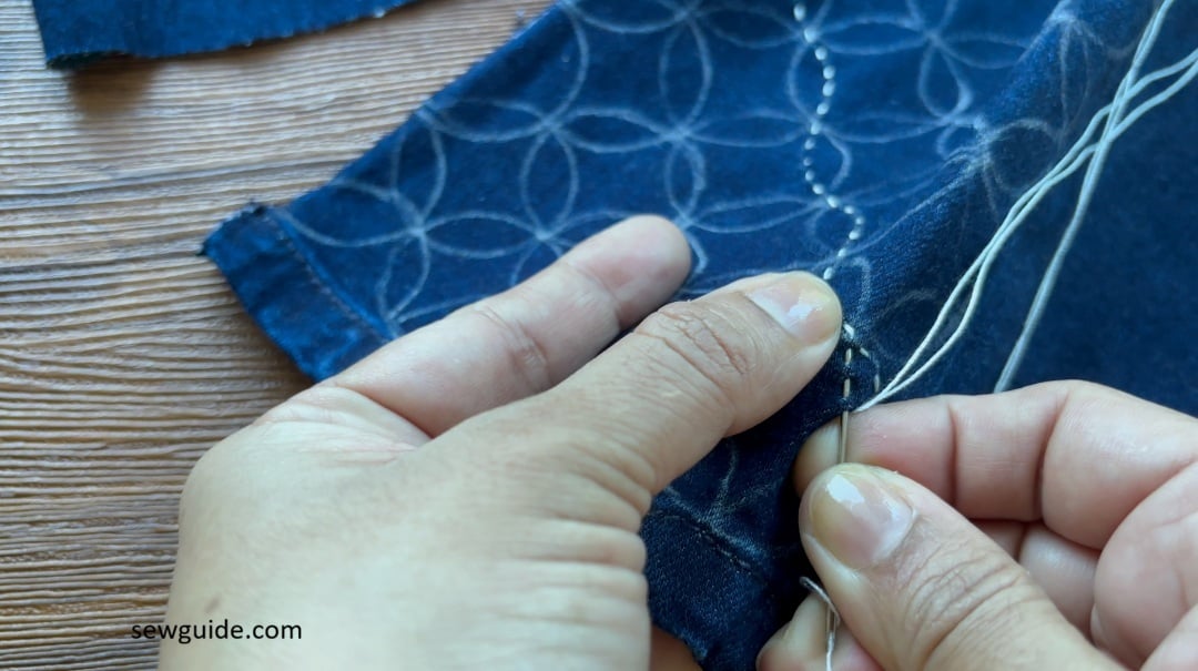 - Instead of sewing one stitch at a time, you should load load multiple running stitches onto the needle. so, you will be using long needle and working a large area at once. Saves a lot of time.