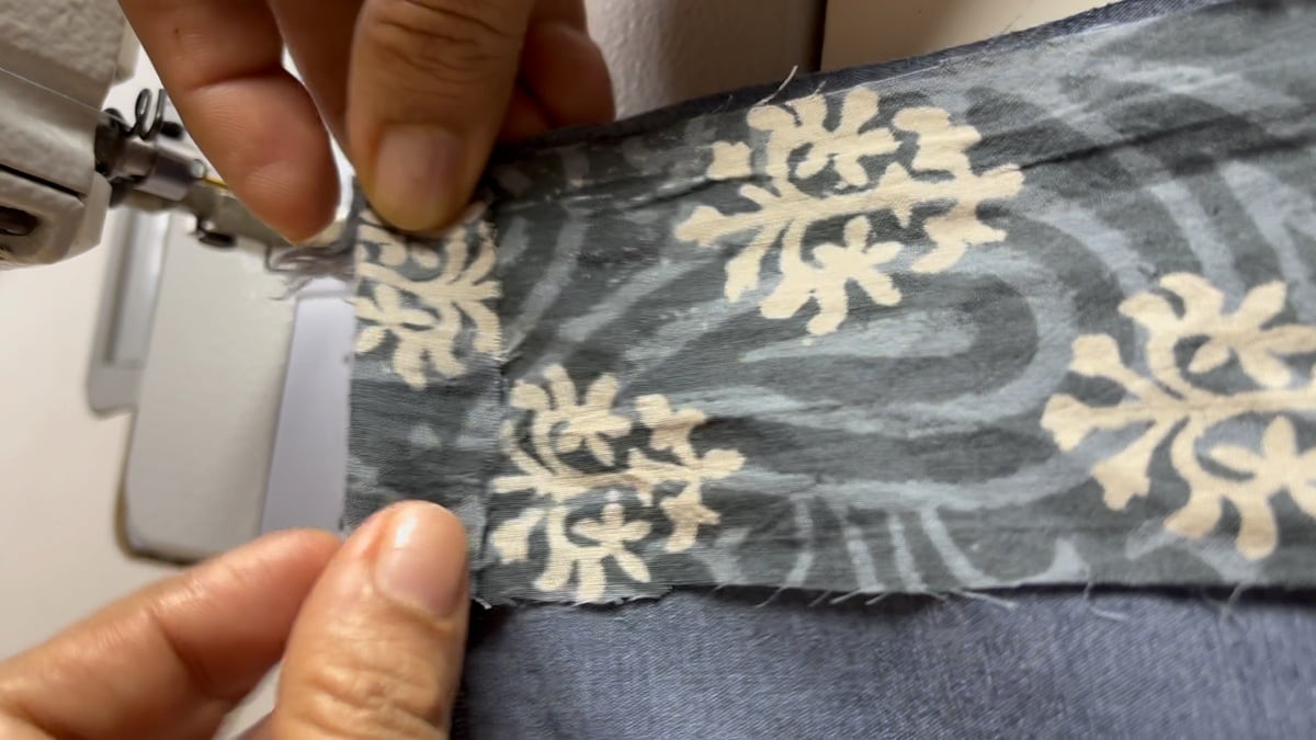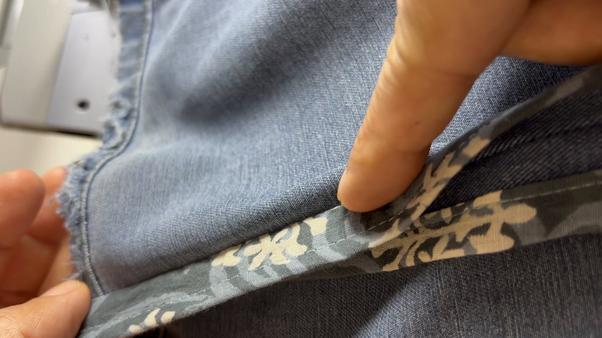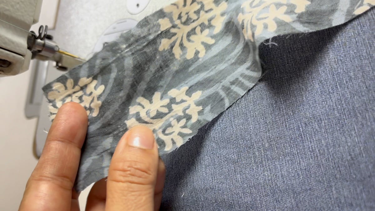 Remember to Fold the top edge of one of fabric strips to the inside. Align it on top of the fabric edges. Place the other fabric strip under the garment edges.