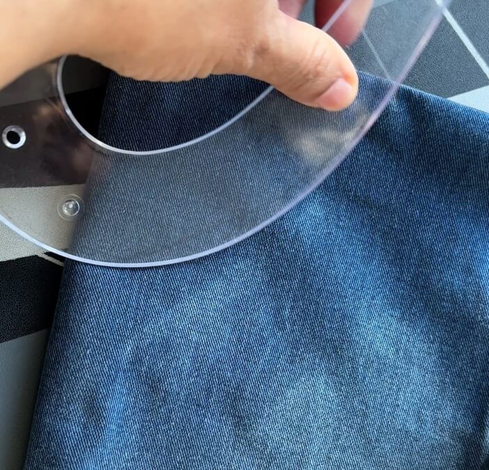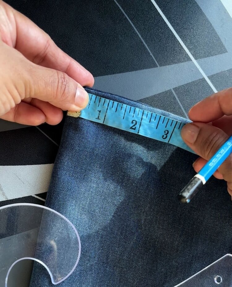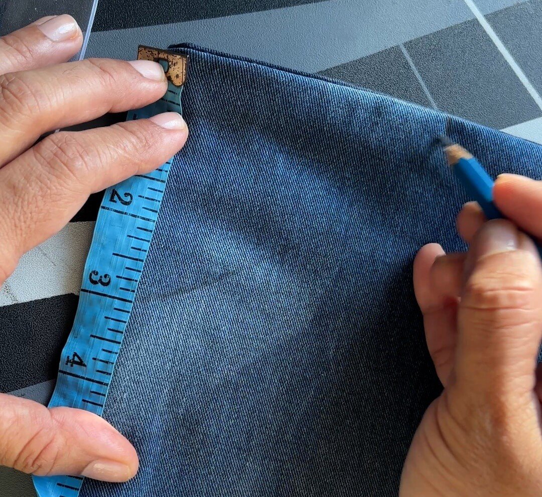 Lay the jeans flat. Measure 18 inch (Length from your shoulder to waist plus seam allowance) If you are using the leg seam, you will not need to leave extra for front piece for the hem. Calculate accordingly.