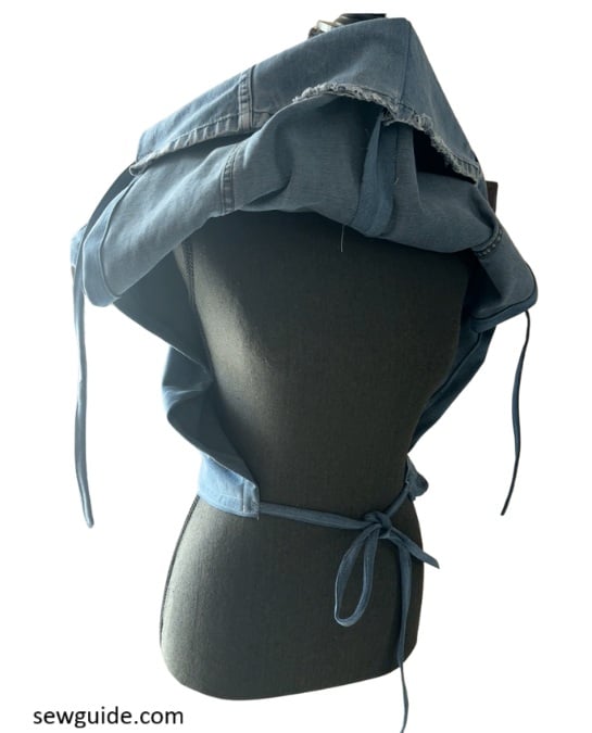 Then bring the wrap ties on the back panel to the front and tie it there. Hide the ties under the hem.