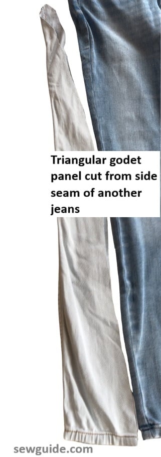 When you cut the godet for making flared jeans you will be cutting a wide triangular insert but for making it straight, you should cut a narrow and long insert.